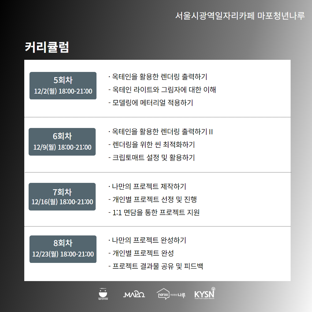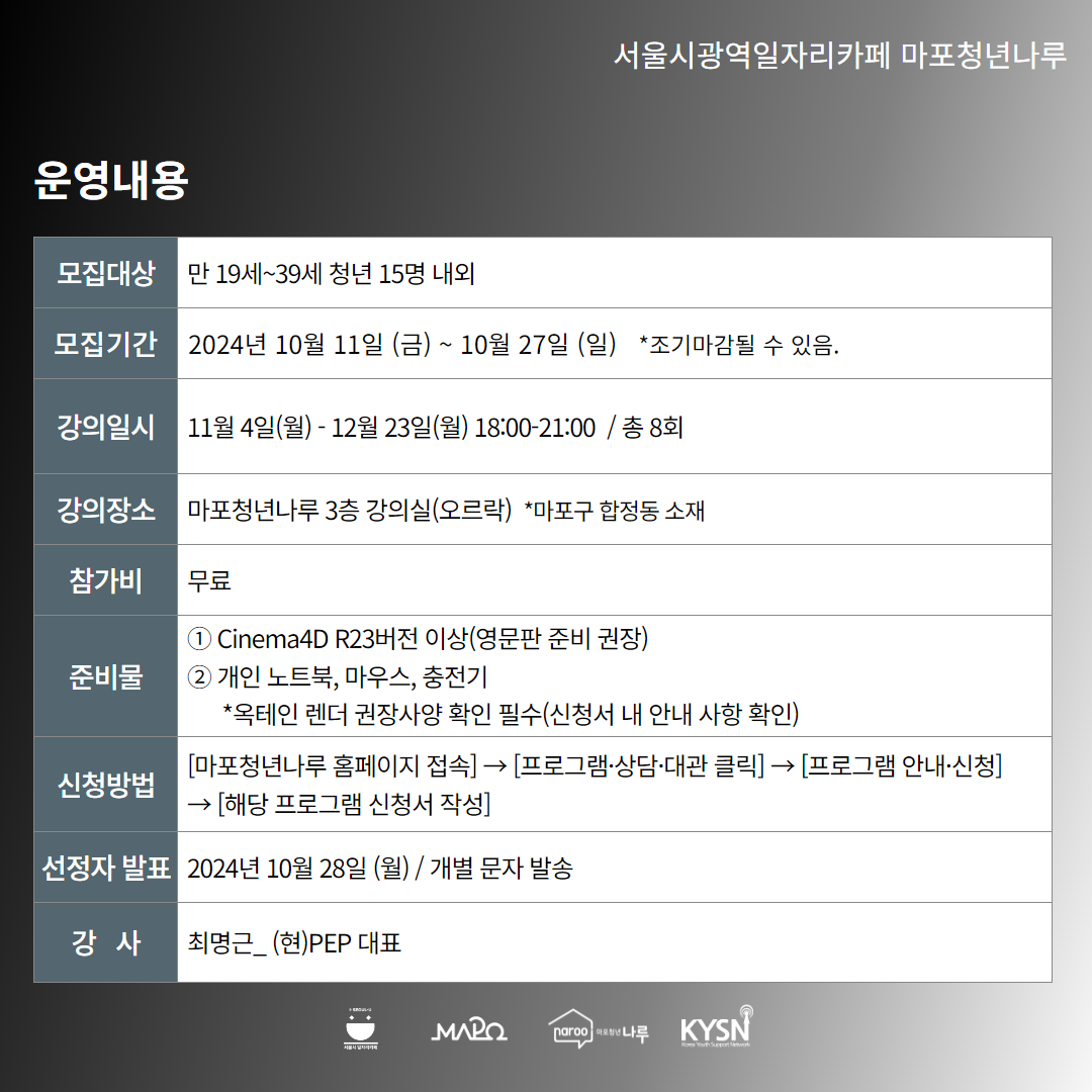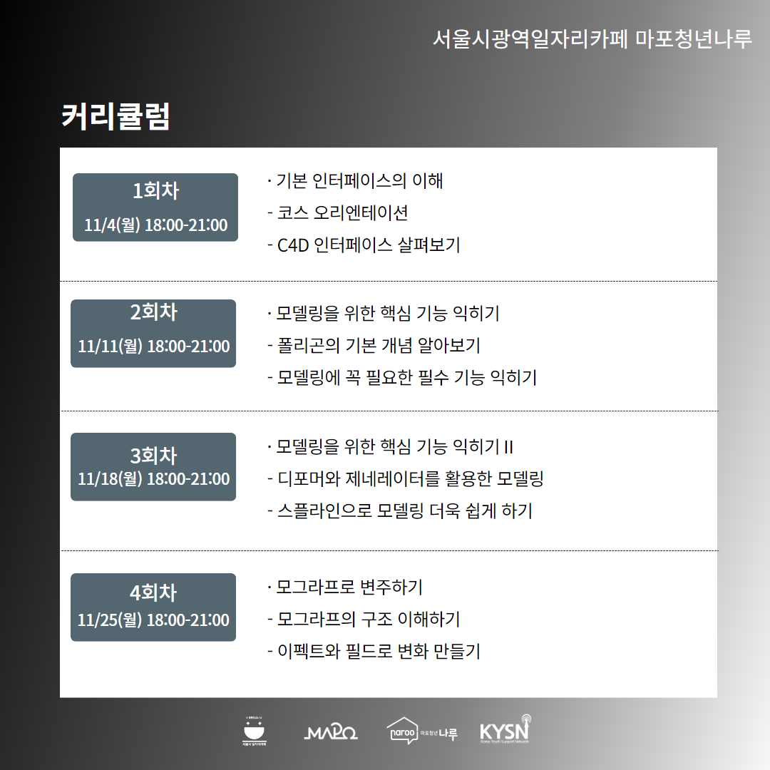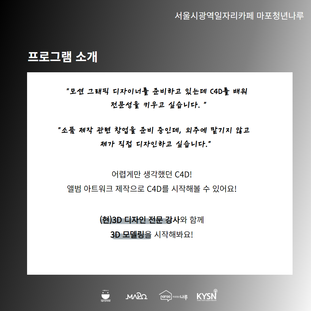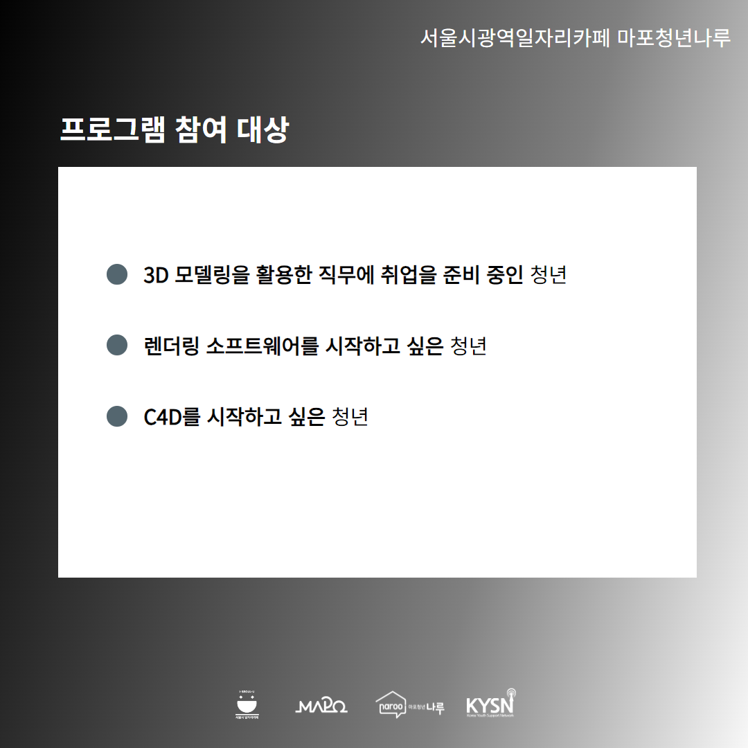 실무에 활용할 수 있는 3D 모델링을 배우고 싶은 청년분들은 해당 프로그램을 신청해주세요!