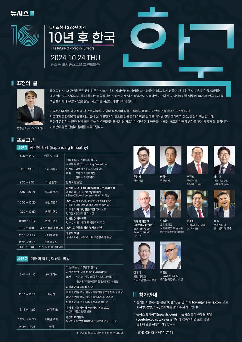 올해로 창사 23주년을 맞은 공감언론 뉴시스는 세상을 보는 눈을 더 넓고 깊게 만들어 가기 위한 <10년 후 한국>포럼을 매년 이어오고 있습니다. 특히 올해는 국 내외 석학들을 불러 모아 불확실성이 지배한 경제적 여건의 대한민국의 국민들이 공감하는 진짜 경제 회복, 자신만의 이익만을 앞세운 편가르기가 아닌 함께 바라볼 수 있는 새로운 미래의 방향을 찾는 강연을 진행합니다.