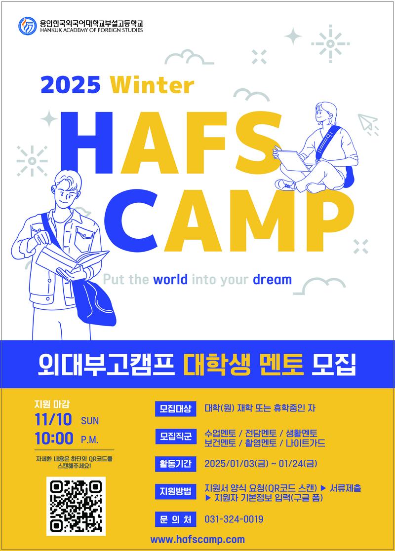 용인한국외대부설고등학교에서 주최하는 제28회 2025 Winter HAFS CAMP에서 참가 학생들의 대학생 멘토를 모집합니다.