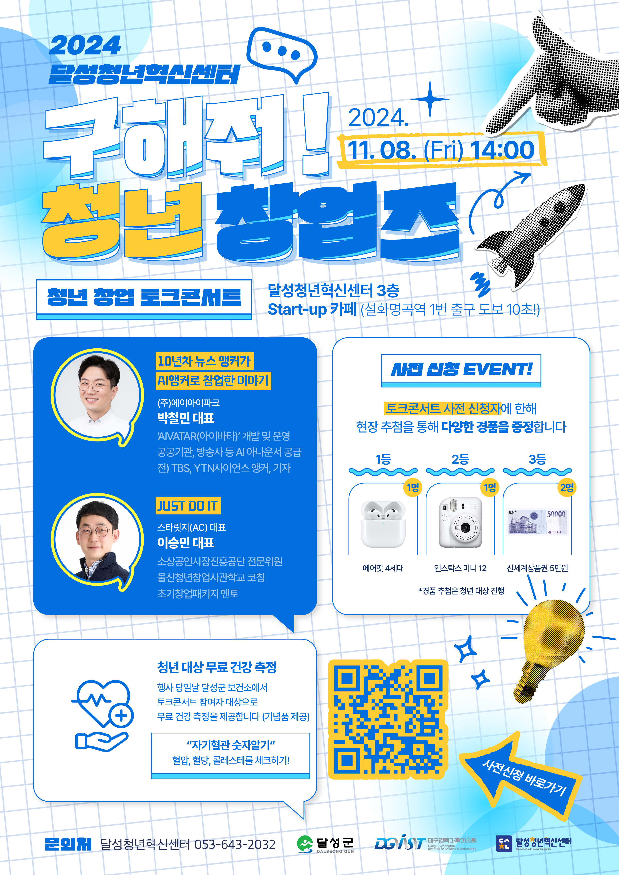 2024 달성청년혁신센터 『구해줘! 청년 창업즈 』청년 창업 토크콘서트 참가자를 모집합니다.