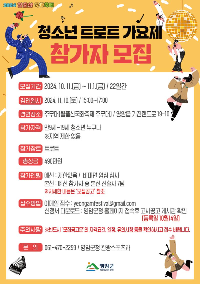 2024 월출산 국화축제 기간 진행되는 『청소년 트로트 가요제』 참가자를 아래와 같이 모집하오니 트로트를 사랑하는 청소년분들의 많은 관심과 참여 바랍니다.