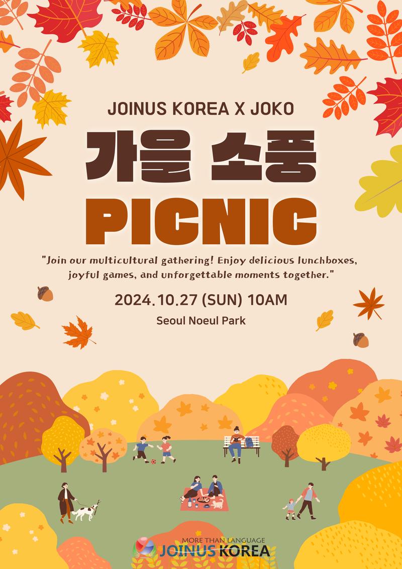 이번 가을, 아름다운 단풍이 물든 계절을 맞아 저희 JOKO에서 즐거운 가을 소풍을 준비했습니다! 가을 소풍에 참여하여 세계 여러 나라 사람들과 어울리며 게임과 이벤트를 즐기고, 언어와 문화를 교류하는 기회를 가져보세요.