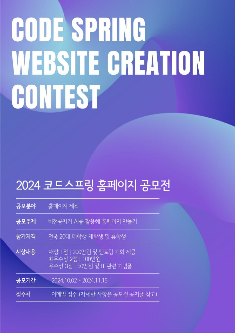 2) Code Spring 홈페이지 제작: AI를 통해 자신만의 홈페이지를 완성하세요. 디자인, 기능, 사용자 경험(UX) 등을 고려하여 자유롭게 창의적인 표현을 담아주시기 바랍니다.