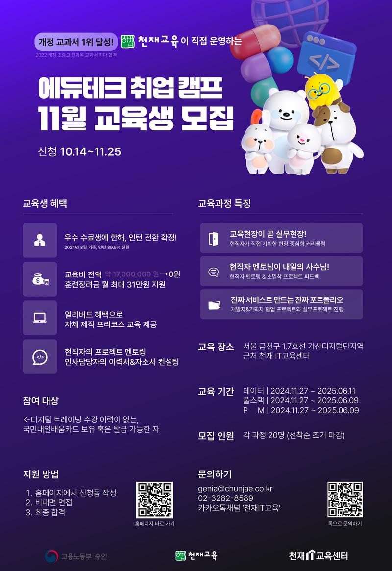 - 교육장소: 1, 7호선 가산디지털단지역 마리오아울렛2관 11층 천재IT교육센터