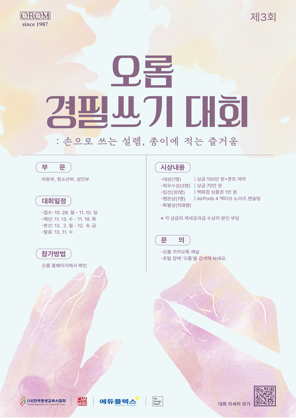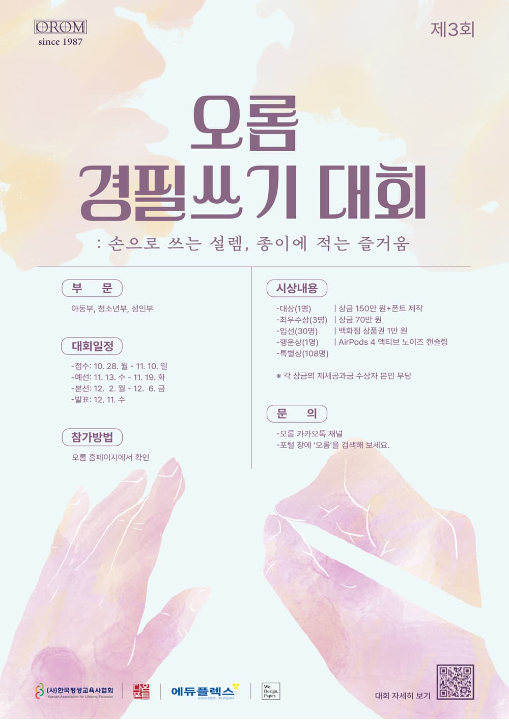 오롬은 손글씨의 즐거움을 널리 알리기 위해서, 그리고 손글씨 문화를 존중하고 이를 보존하기 위해서 매년 경필쓰기 대회를 개최합니다.