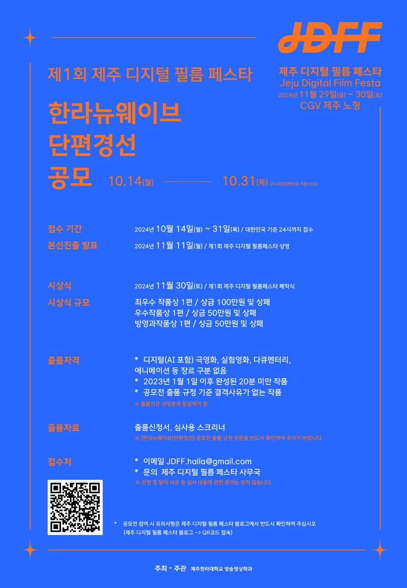 제주한라대학교 방송영상학과가 주최‧주관하는 <2024 제1회 제주 디지털 필름 페스타>가 2024년 11월 29일(금)~30일(토) 이틀간 개최됩니다. 영화제 경쟁 섹션 ‘한라뉴웨이브(HallaNewWave)’에 상영할 단편 영화를 공모합니다. 많은 관심과 참여 바랍니다. 자세한 내용은 아래를 확인하세요.