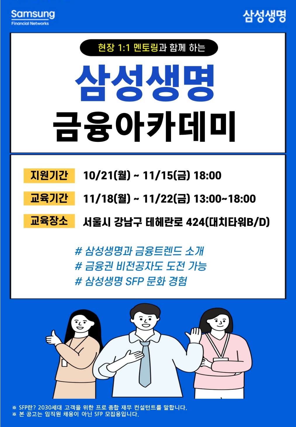삼성 금융아카데미프로그램 과정은 취업을 앞둔 대학생들의 희망찬 비전을 위해 다양한 지식과 경험의 장을 만들어 드립니다. 삼성 금융연수프로그램 과정을 통해 당신의 가능성을 발견하세요.