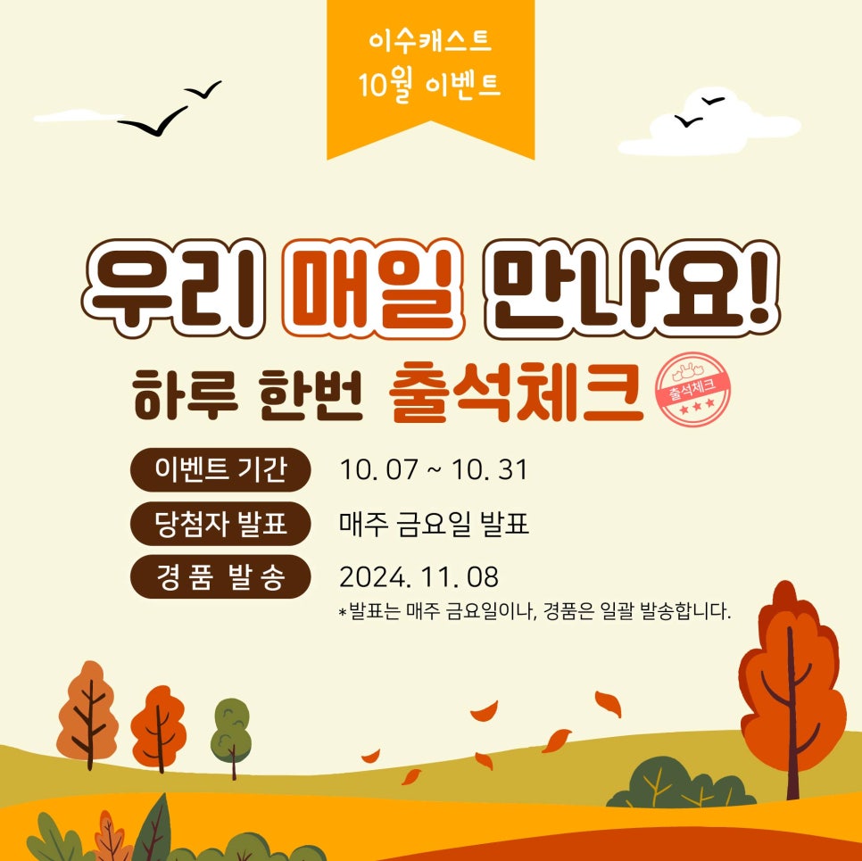 이수캐스트에서 2024년 10월 출석체크 이벤트를 진행합니다.
