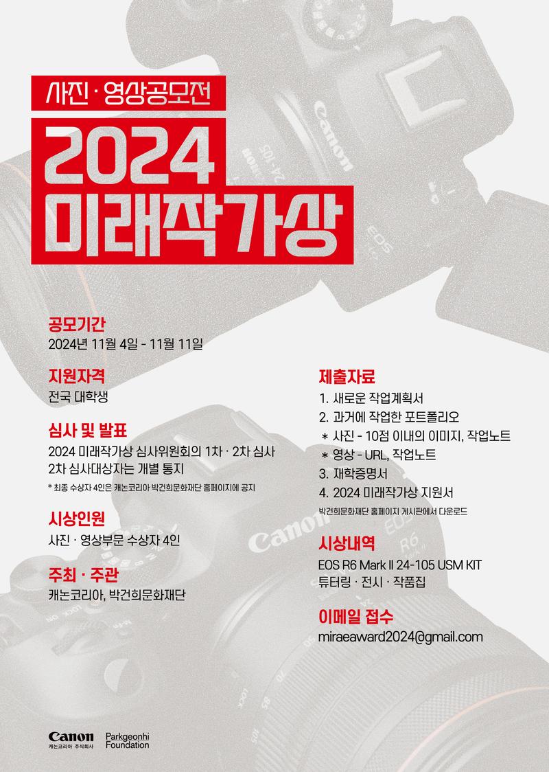 * 수상자는 수상받은 카메라로 작업계획서에 의한 작업을 진행하며, 이 작업물은 2025년 캐논 갤러리에서 전시될 예정