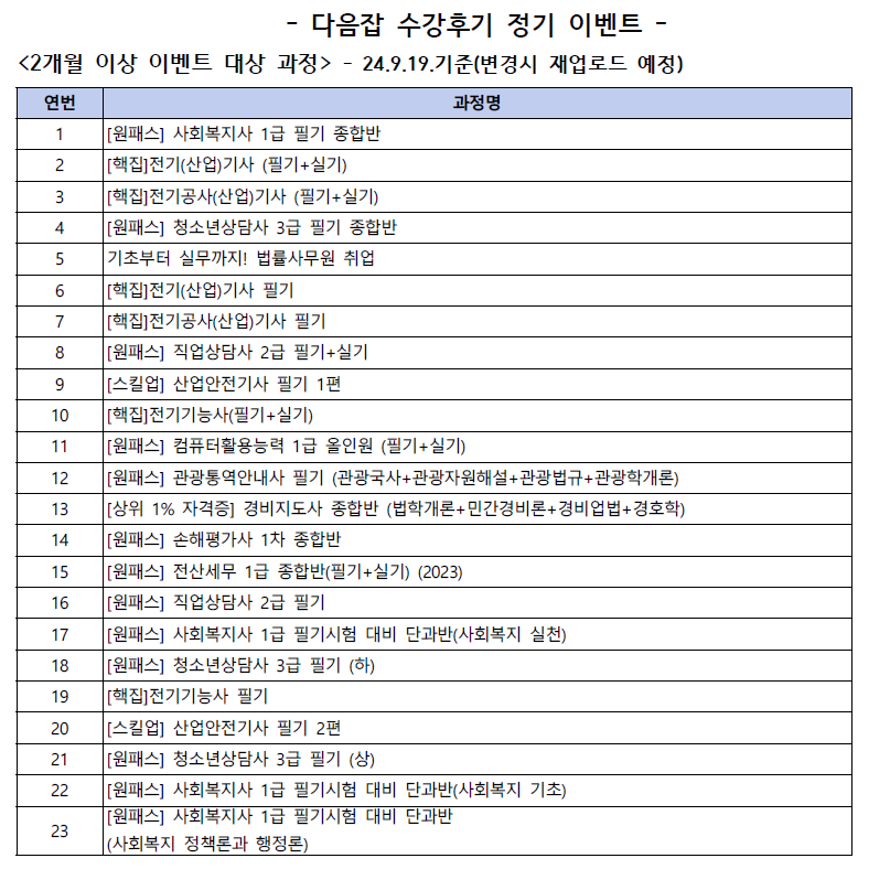 - 최우수, 우수 수강후기: 익월 첫주에 선정 후 발표