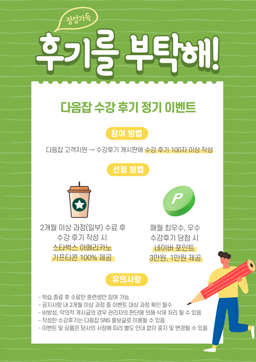 내일배움카드로 다음잡 온라인 과정을 열심히 수강하고 수강하면서 느꼈던 점, 취/창업 성공, 자격증 합격 등 수강후기를 작성해주신다면 기프티콘을 보내드립니다!