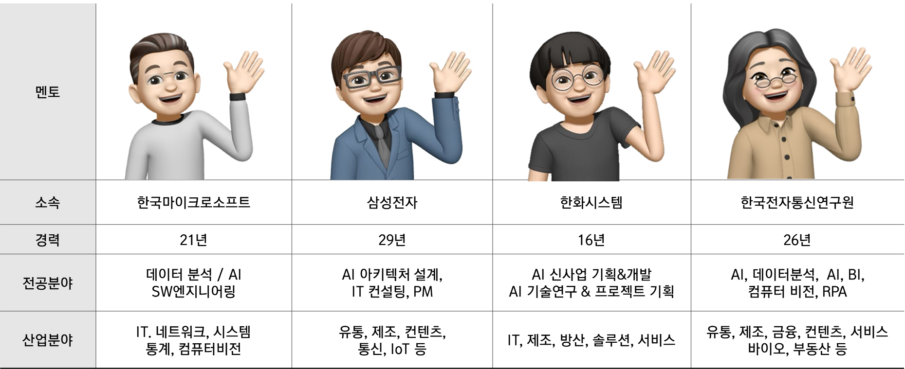 ✔ 5-6명으로 구성된 프로젝트 팀 그룹별 상기 멘토 1~2명 배정되어 프로젝트 리드 및 컨설팅