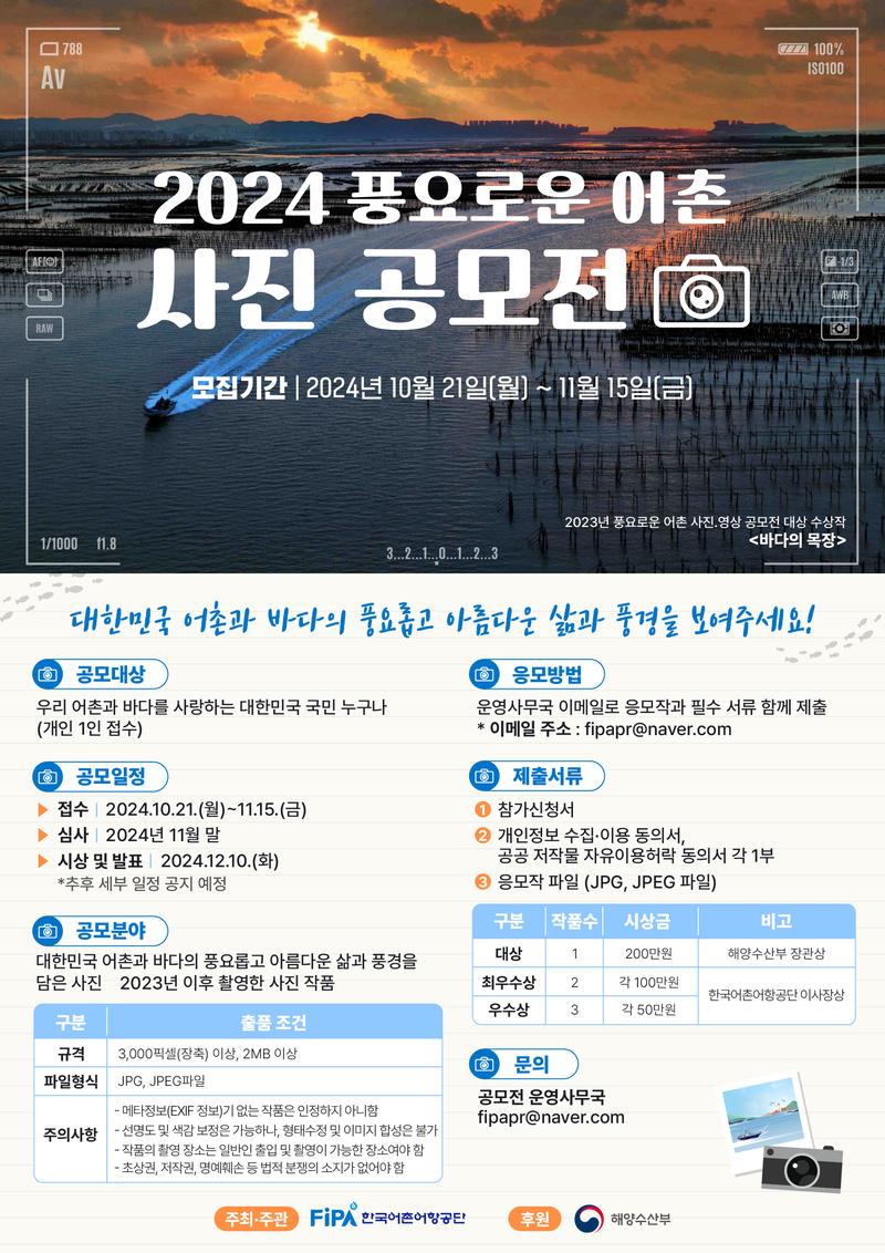 [한국어촌어항공단] 2024년 풍요로운 어촌 사진 공모전 (~11/15)