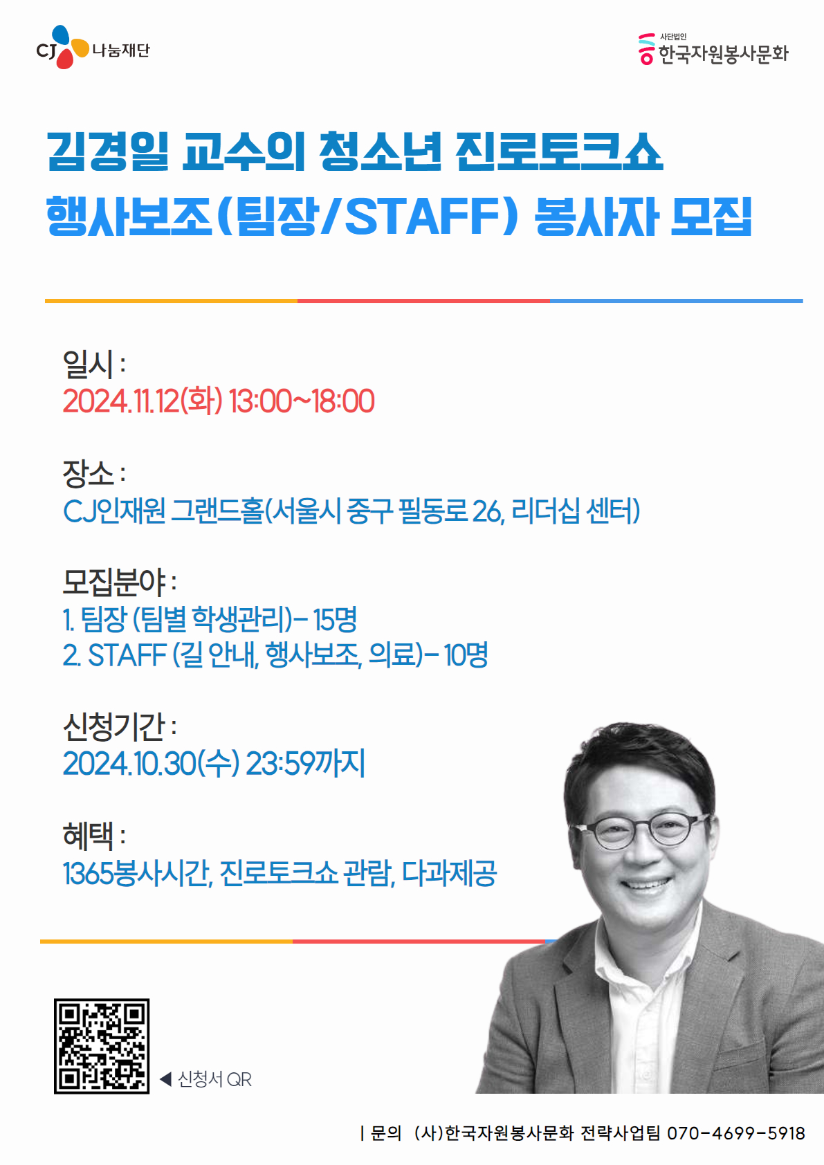 “CJ그룹 김경일 교수의 청소년 진로토크쇼” 행사보조(팀장/STAFF) 봉사자 모집(~10/30)