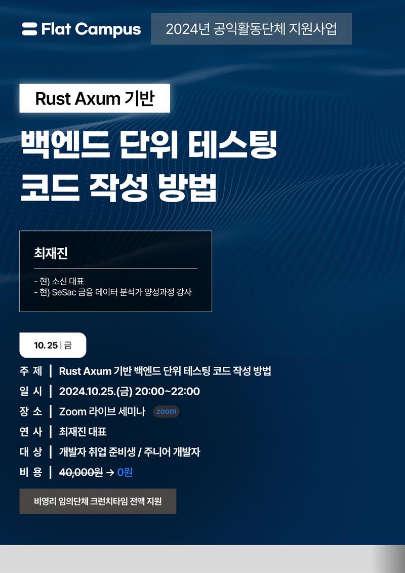 이번 세미나에서는 Rust Axum 기반으로 백엔드 단위 테스트 코드를 잘 작성하는 방법과 작성해야 하는 이유를 명확하게 설명해드립니다.