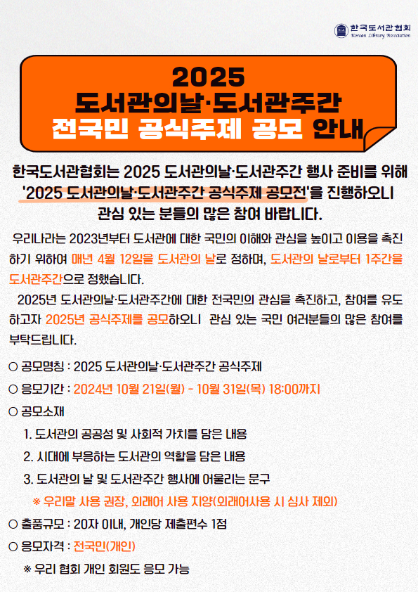 ○ 공모명칭 : 2025 도서관의날·도서관주간 공식주제