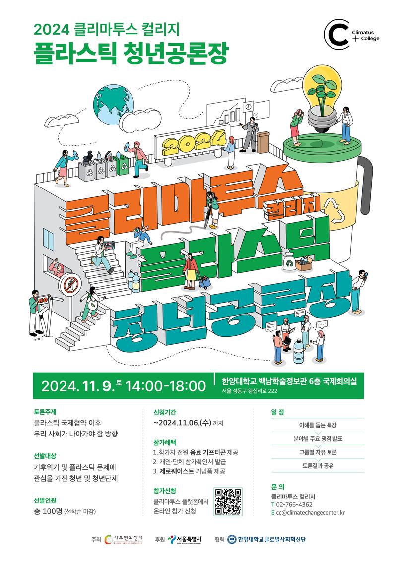 「클리마투스 플라스틱 청년공론장」은 오는 11월 말 플라스틱 오염 종식을 위해 개최되는 '제5차 정부간협상위원회(INC-5)'의 관심을 높이고, 플라스틱 국제협약 이후 우리 사회가 나아가야 할 방향에 대해 청년들이 함께 토론하고 공유하며 기후위기 대응과 플라스틱 문제 해결을 위한 방안을 찾고자 합니다.