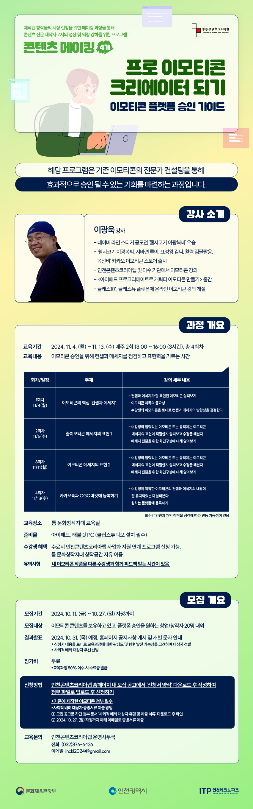 ▶ 교육문의: 인천콘텐츠코리아랩 운영사무국 032-876-6426 / 010-9094-5670 inckl2024@gmail.com