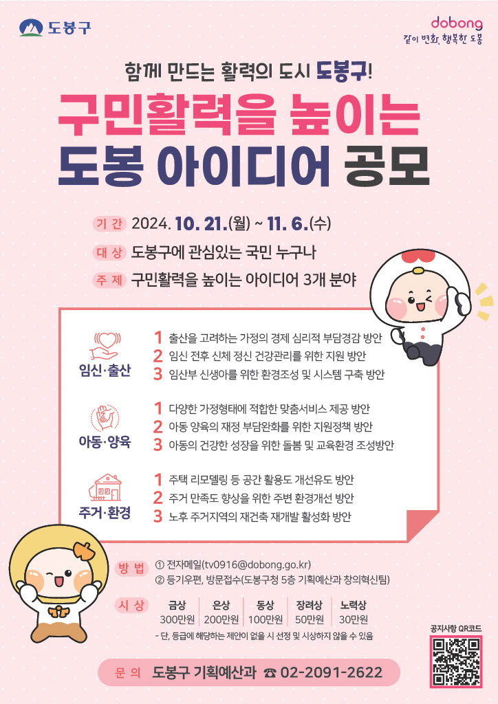 도봉구에서는 구민활력을 촉진하는 아이디어를 발굴하기 위해 「구민활력을 높이는 도봉 아이디어 공모」를 다음과 같이 개최하오니 뛰어나고 참신한 아이디어를 가진 분들의 많은 참여바랍니다.