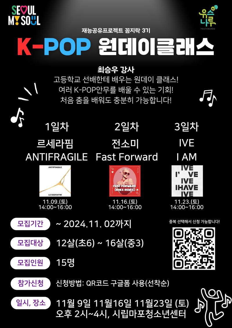 [์ฌ๋ฅ๊ณต์ ํ๋ก์ ํธ ๊ผผ์ง๋ฝ] K-POP ์๋ฌด๋ฅผ ํ๋ฃจ ๋ง์ ๋ฐฐ์ฐ๊ณ ์ฆ๊ธธ ์ ์๋ ๊ธฐํ์ ๋๋ค! ๐ถ ์ถค์ ์ฒ์ ๋ฐฐ์ฐ๋ ์น๊ตฌ๋ค๋ ์ถฉ๋ถํ ์ฐธ์ฌ ๊ฐ๋ฅํ๋ ๊ฑฑ์ ๋ง์ธ์! ๐ ์ด๋ฒ ํด๋์ค๋ ์ด 3ํ์ฐจ๋ก ์งํ๋๋ฉฐ, ๊ฐ๊ฐ ๋ค๋ฅธ ๊ณก์ ์๋ฌด๋ฅผ ๋ฐฐ์ธ ์ ์์ต๋๋ค. ์ํ๋ ํ์ฐจ๋ฅผ ์ ํํ์ฌ ์๊ฐ์ด ๊ฐ๋ฅํ๋, ๋ถ๋ด ์์ด ์ ์ฒญํด์ฃผ์ธ์! ๐ค