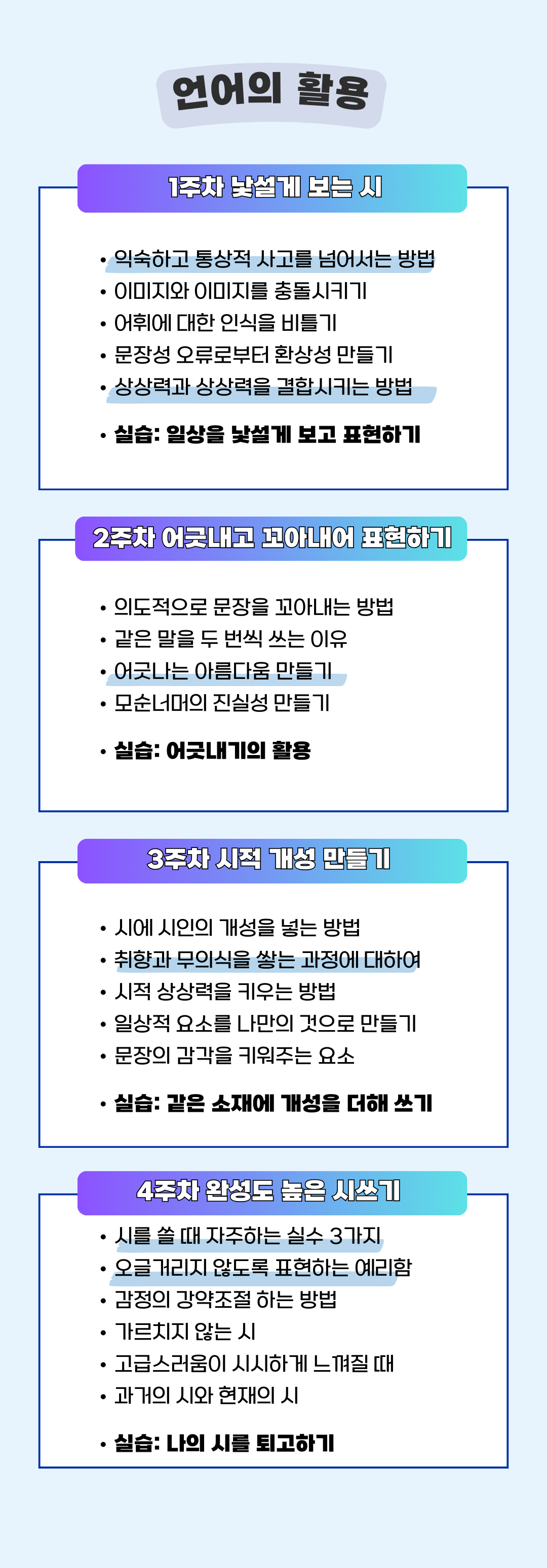 작필 시 초급반은 ‘시의 구성’과 ‘언어의 활용’ 프로젝트가 번갈아가며 개설됩니다.