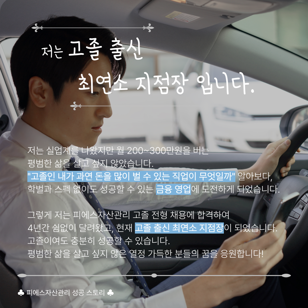 '피에스자산관리'X'피에스캠퍼스'에서 진행하는 이번 11월 취업 멘토링은 어려운 여건 속에서 멘토를 만나 금융권의 성공 신화를 쓰고 있는 실제 주인공의 이야기로 진행됩니다.
