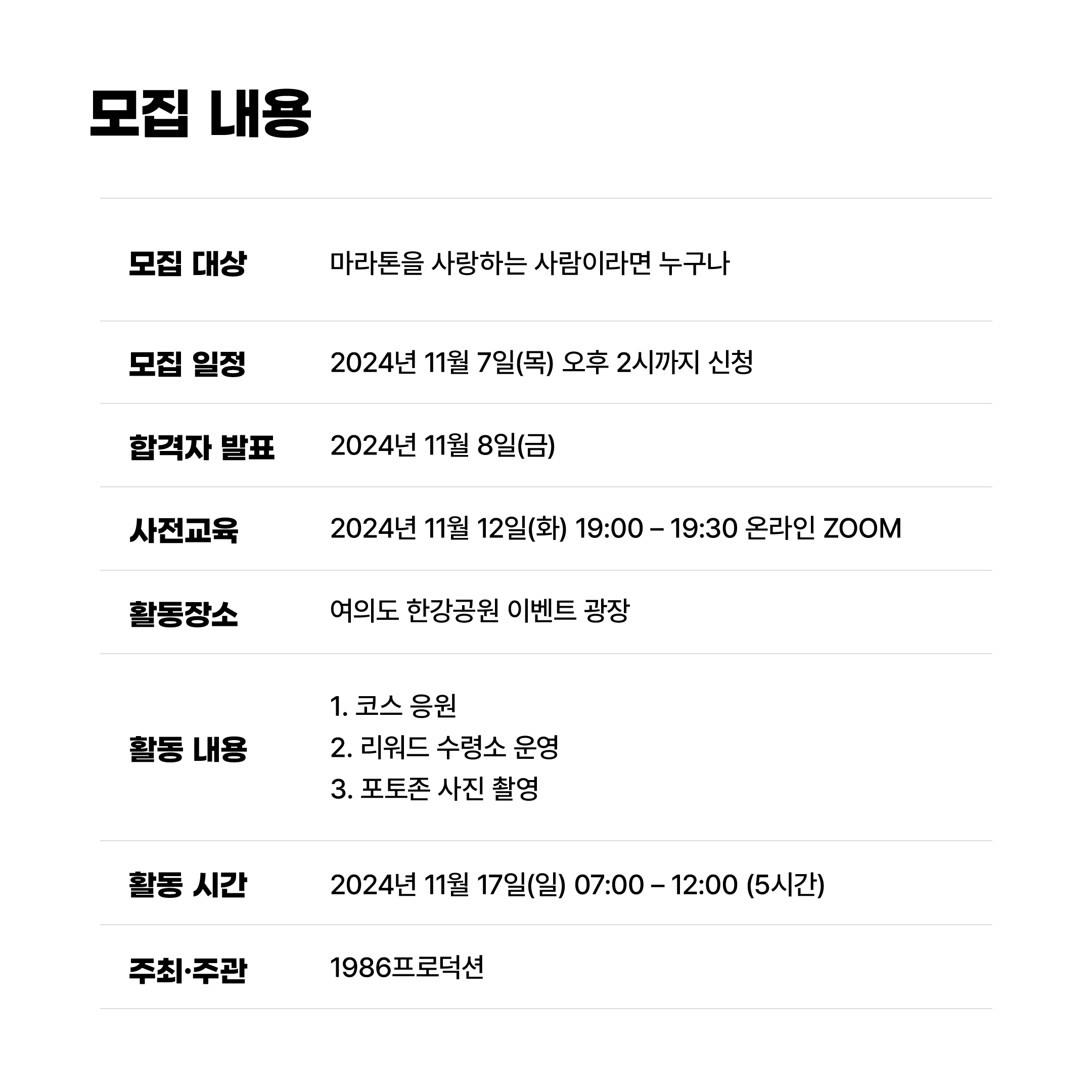 러너들의 마라톤 도전과 완주를 응원하고 축하해줄 자원봉사자를 모집합니다!