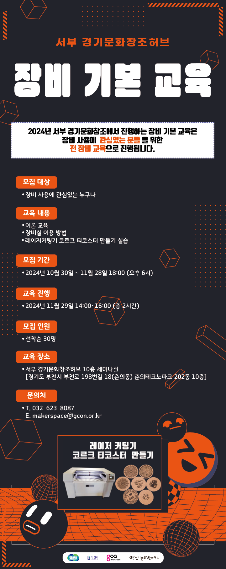 ▶ 교육 내용 : 1) 장비 이론 2) 장비 이용 방법 3) 레이저 커팅기 활용 코르크 티코스터 만들기 실습