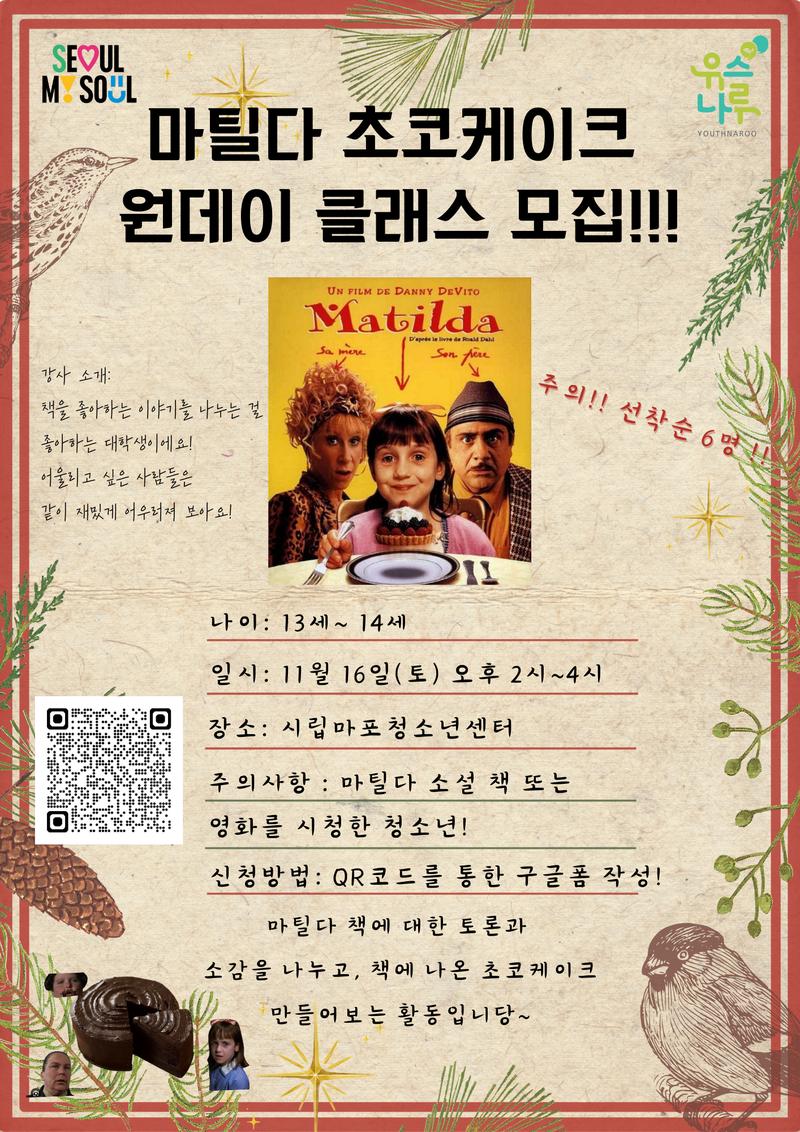 책을 좋아하는 친구들 모여라! 📚🍫 마틸다의 이야기를 함께 나누고, 책 속에 등장하는 초코케이크도 만들어볼 기회! 이 흥미진진한 활동에 참여하고 싶은 친구들은 서둘러 신청해 주세요.