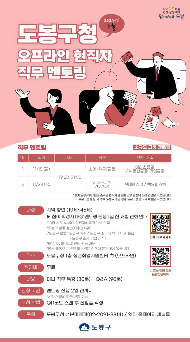 취업 준비 청년의 취업 경쟁력 향상을 위해 11월 현직자 직무멘토링(금융, 서비스기획)을 운영하니, 관심있는 청년들의 많은 참여 바랍니다.