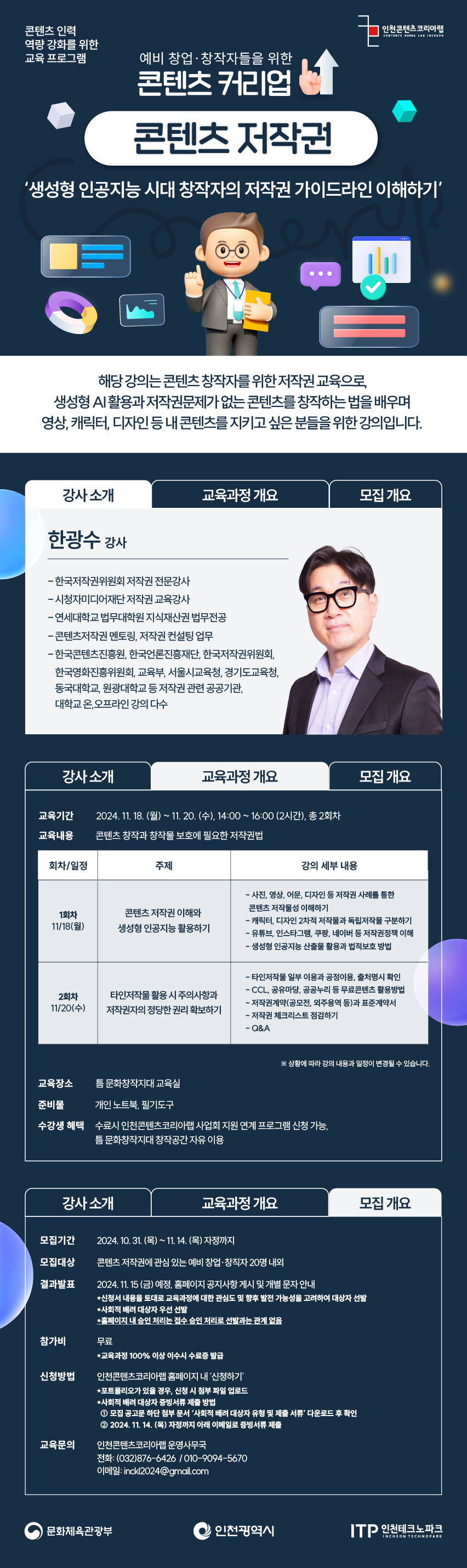 ▶ 교육문의: 인천콘텐츠코리아랩 운영사무국 032-876-6426 / inckl2024@gmail.com