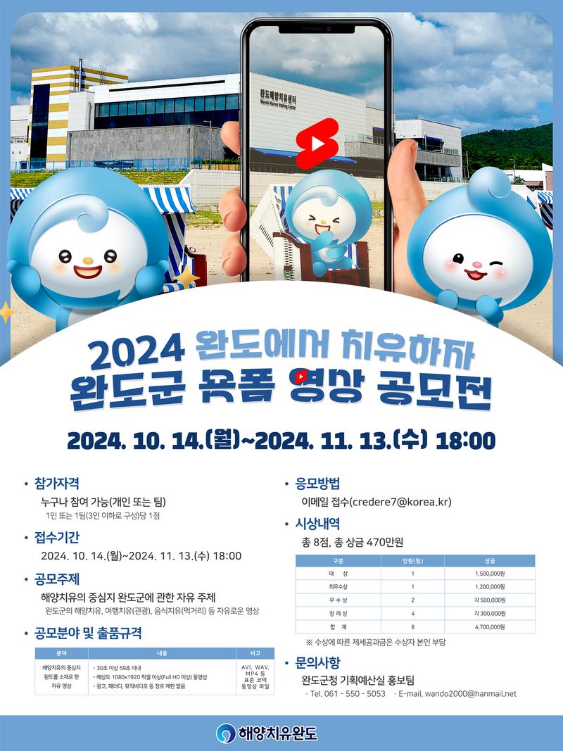 ‘해양치유의 중심지’ 완도군의 해양치유, 관광, 먹거리 등을 소재로 한 참신하고 재치있는 영상을 발굴하여 완도군 홍보에 활용하고자 「완도군 공식 유튜브 숏폼 영상 공모전」을 다음과 같이 개최하오니 국민 여러분의 많은 참여 바랍니다.