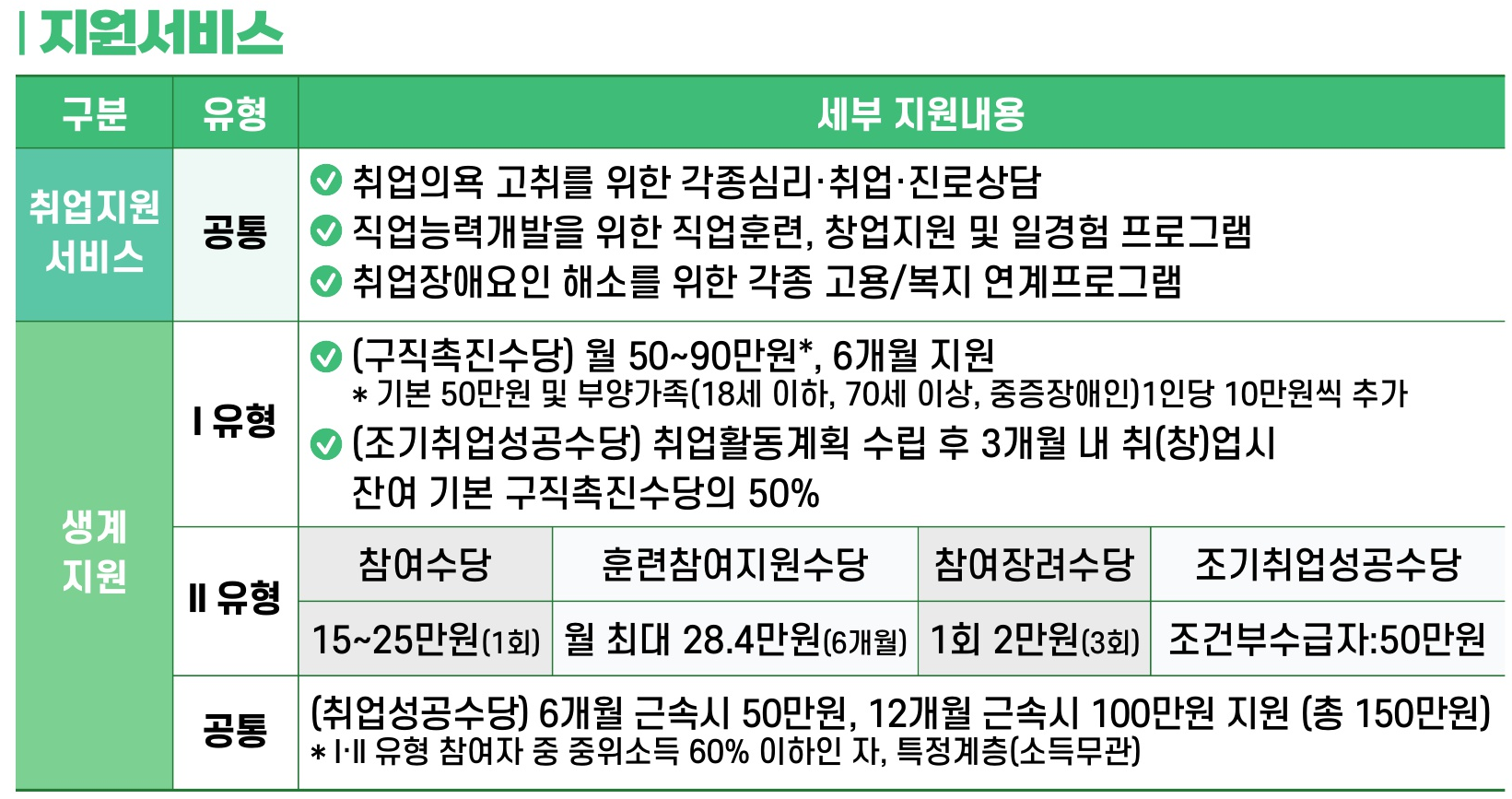 • 고용노동부에서 추진하는 사업으로 "만 15세 ~ 69세의 근로능력과 구직의사가 있는데도 취업이 어려운 분들께 취업지원서비스와 생계를 지원하여 구직활동과 생활안정을 지원하는 제도입니다.