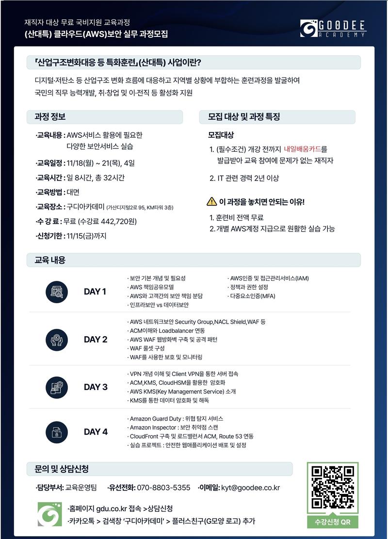 IT 직무 담당자에게 클라우드 서비스 활용능력이 요구되고 있고, 더불어 클라우드 보안이 중요해지고 있습니다. AWS의 보안서비스를 경험하고 익힐 수 있는 좋은 기회입니다.