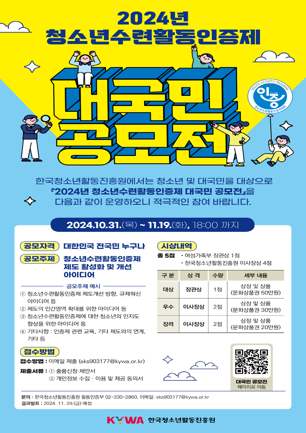 문의: 한국청소년활동진흥원 활동인증부 02-330-2860, 이메일: sks903177@kywa.or.kr