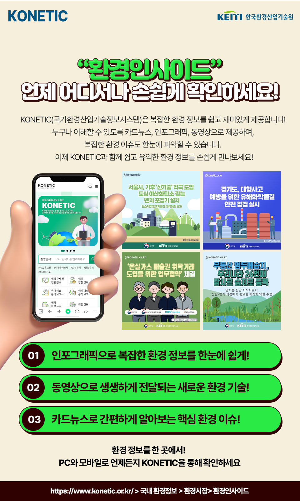 한국환경산업기술원이 운영하는 "국가환경산업기술정보시스템(KONETIC)"을 통해 복잡한 환경 정보를 쉽고 재미있게 만나보세요.