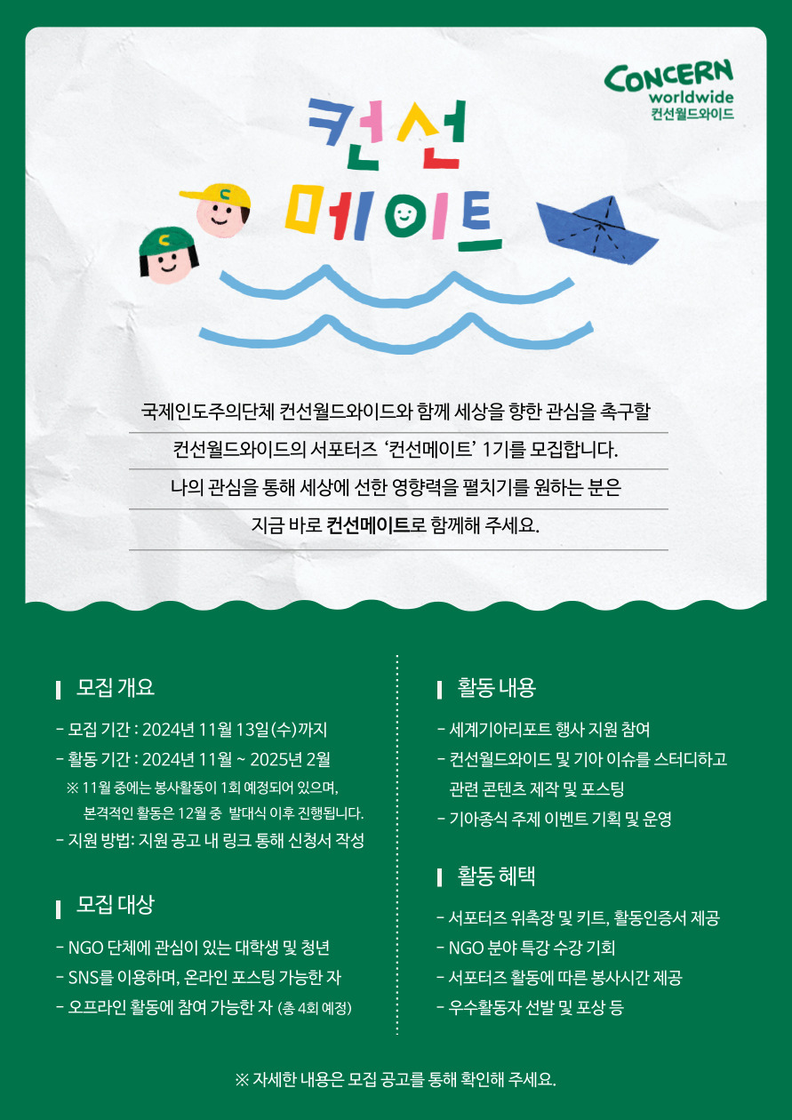 국제인도주의단체 컨선월드와이드와 함께 세상을 향한 관심을 촉구할 컨선월드와이드의 서포터즈 ‘컨선메이트’ 1기를 모집합니다.