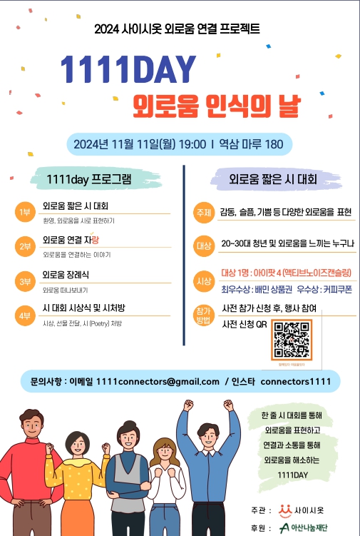 1111day의 다양한 프로그램을 통해 외로움은 나 혼자만의 문제가 아닌 사회 문제이며, 연결과 소통을 통해 함께 해결해 나가야 한다는 것을 인식하는 시간을 가져보세요!