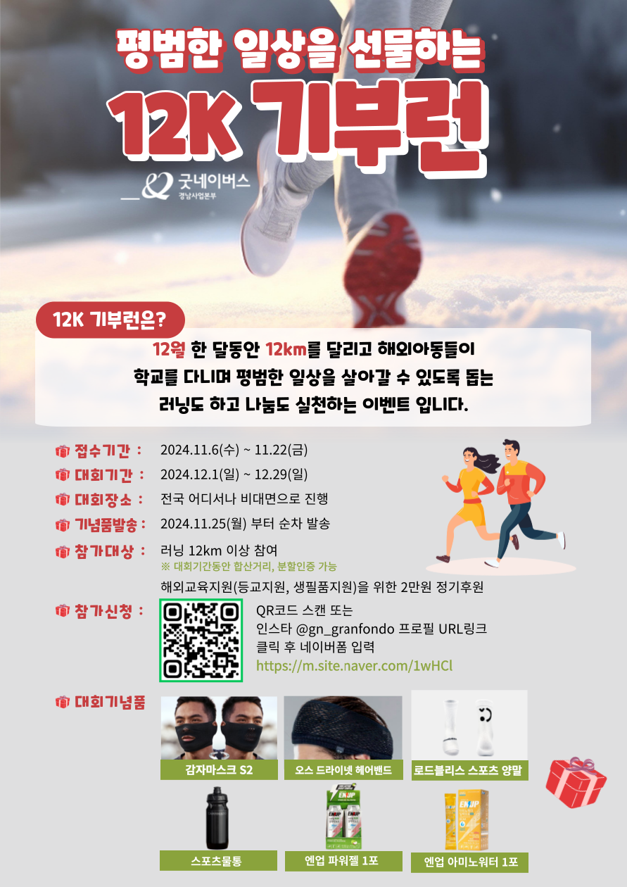 12월 한 달동안 12km를 달리고 해외아동들이 학교를 다니며 평범한 일상을 살아갈 수 있도록 돕는 러닝도 하고 나눔도 실천하는 이벤트 입니다.