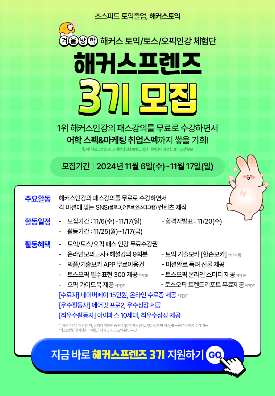 - 체험단 활동을 통해 제공된 해커스 토스오픽 강의는 활동종료 시까지 수강 가능합니다.