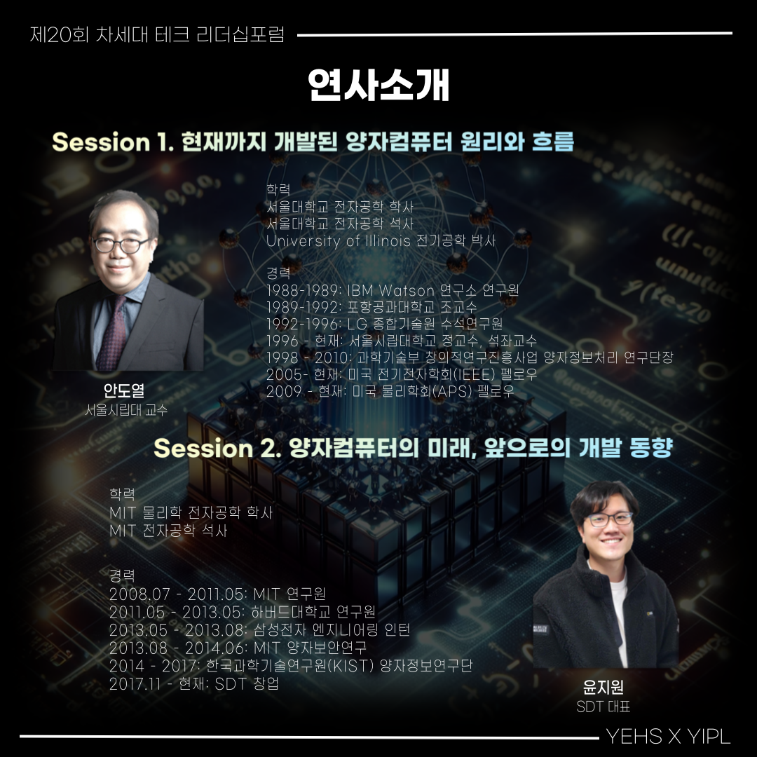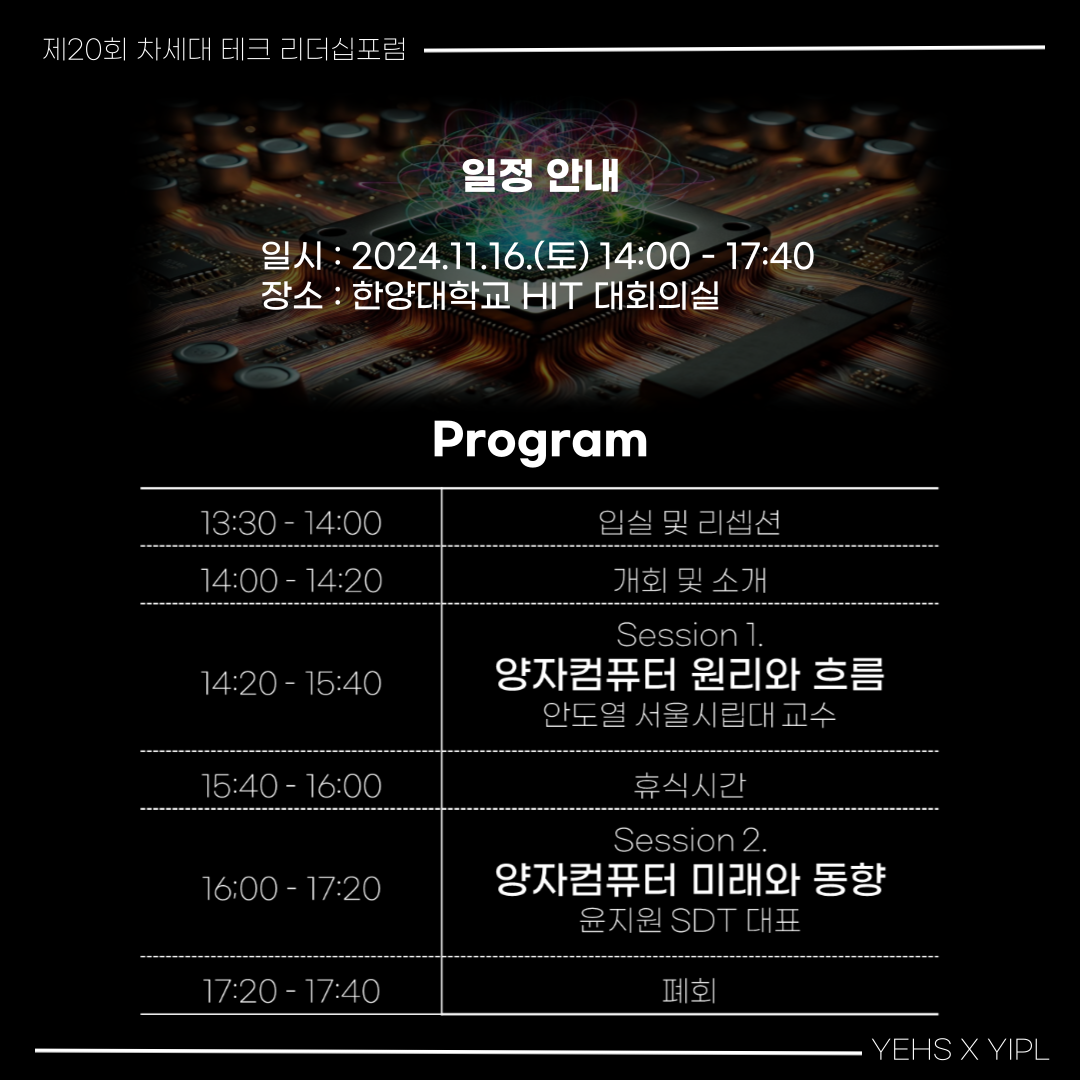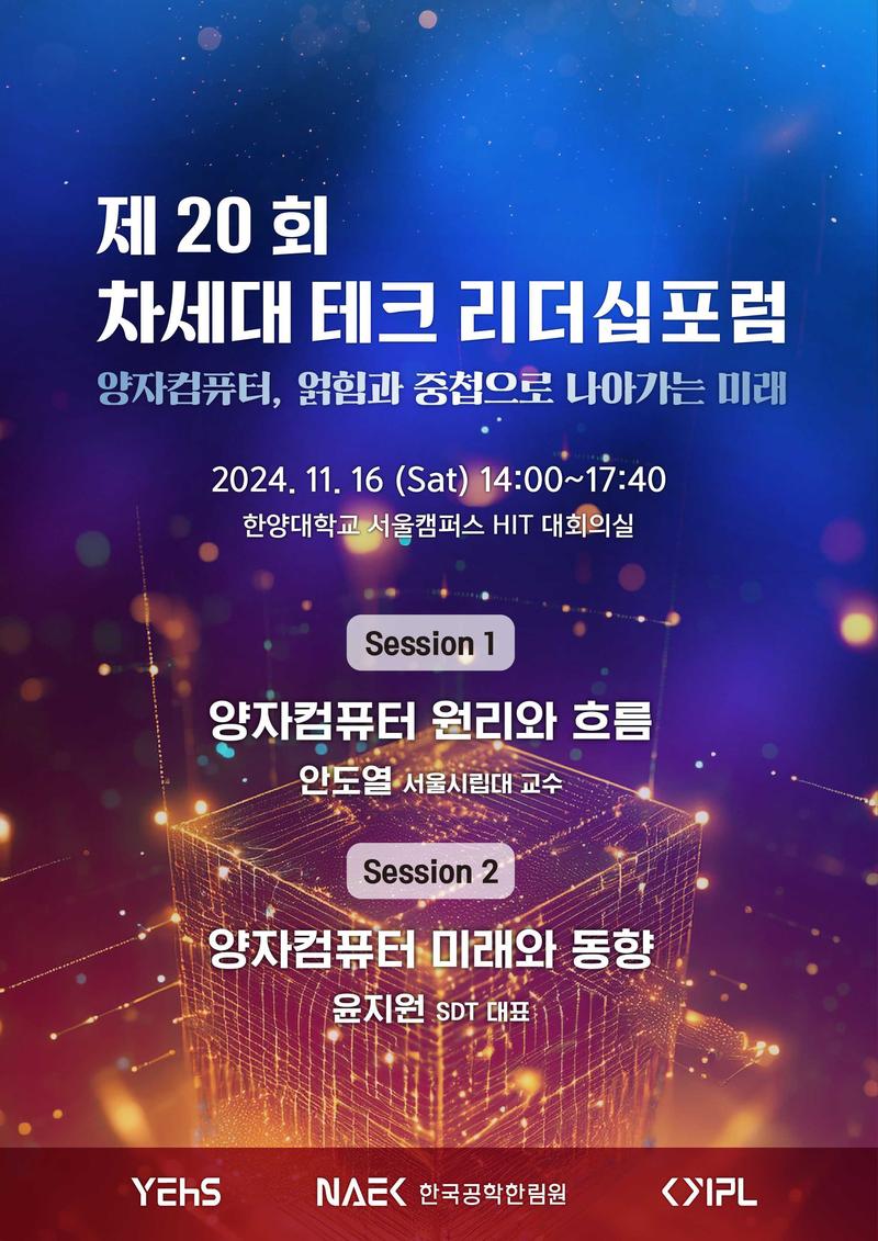 한국공학한림원 산하의 YEHS와 YIPL에서 제20회 차세대테크 리더십 포럼을 개최합니다! 이번 포럼의 주제는 미래를 이끌어갈 혁신 기술, 바로 양자 컴퓨터입니다.