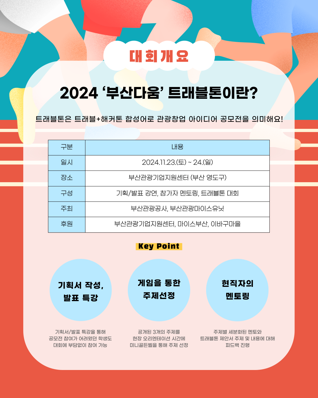 장차 부산의 미래에 더욱 의미 있는 여행 경험을 창출하고자 [ 2024 부산다움 트래블톤 ] 을 개최하니, 관광 및 MICE 분야에 관심있는 관광 예비 인재분들의 많은 참여 부탁드립니다