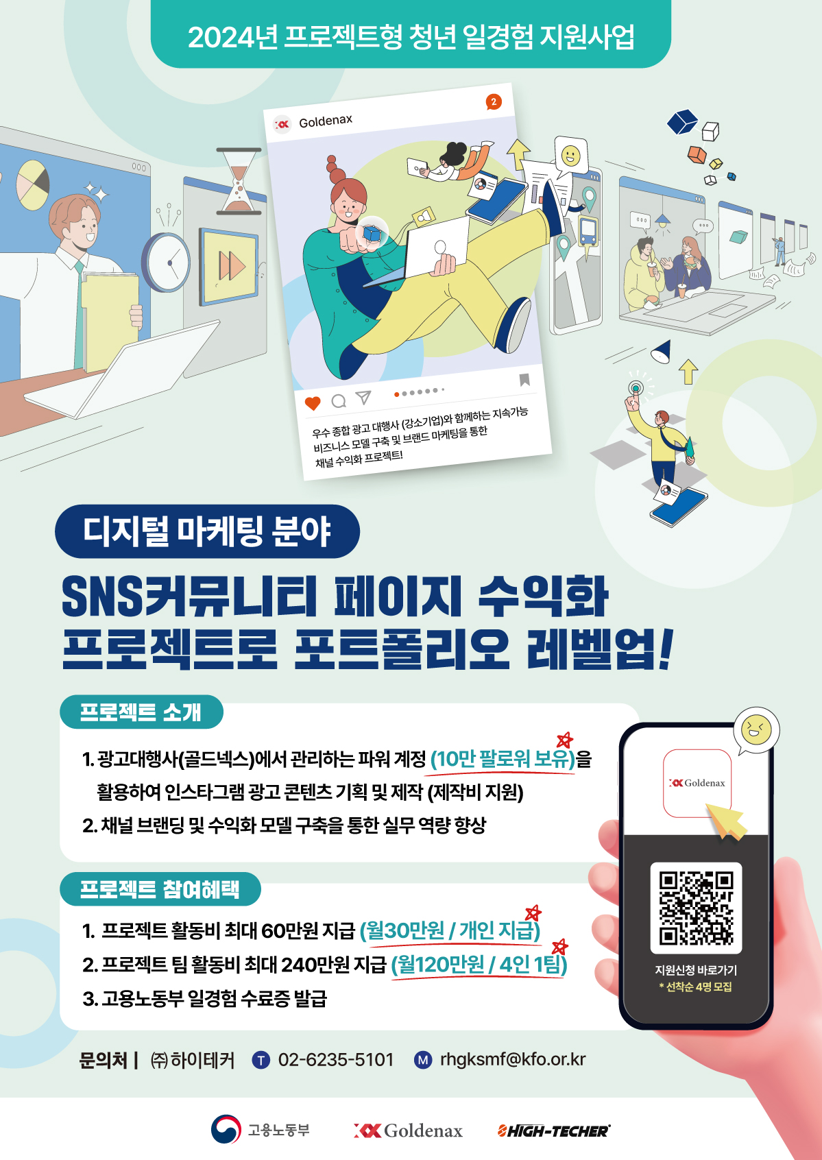 선착순 4명 한정!! 다채로운 마케팅 솔루션을 제공하는 광고 대행사 골드넥스와 함께하는 'SNS커뮤니티 페이지 수익화 프로젝트' 참여자를 모집합니다! 골드넥스 디지털 마케팅 실무 프로젝트 경험으로 실무역량 습득부터 포트폴리오 완성까지! 원패스 구직역량 강화 프로젝트 -