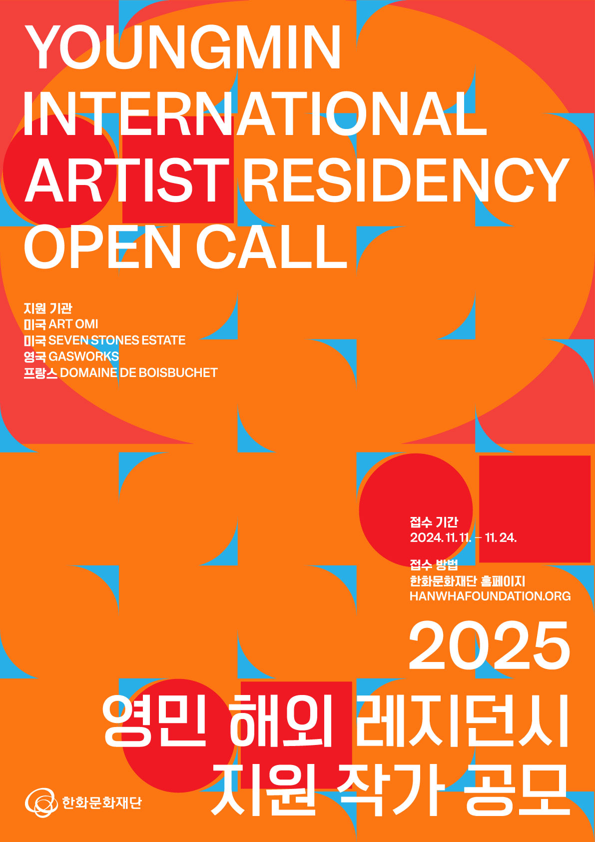한화문화재단은 한국의 유망한 신진 예술가를 발굴하고자 해외 유수의 미술 관련 기관 간 협력을 통해 국내 예술인에게 해외 레지던시 입주 기회를 제공하는 『영민 해외 레지던시 지원 프로그램』 공모를 개최합니다.