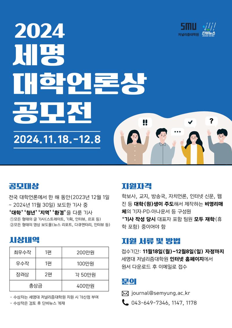 세명대학교 저널리즘대학원‧저널리즘연구소가 ‘2024 세명 대학언론상’ 공모전을 개최합니다. 올해로 3회를 맞는 세명 대학언론상은 전국 대학언론을 대상으로 의미 있는 보도 사례를 발굴해 시상함으로써 대학언론의 비판 활동과 청년 공론장 역할을 지원하고, 대학언론의 바람직한 지향점을 제시하고자 하는 대회입니다. 전국 대학 학보사, 교지, 방송국, 자치언론, 인터넷 신문, 웹진 등 대학(원)생이 주도해서 제작하는 비영리매체의 구성원이라면 누구나 참여할 수 있습니다. 지난 1년 동안 대학언론에 보도된 기사 중 ‘대학’‘청년’‘지역’‘환경’을 다룬 글과 영상을 응모해주세요. 수상자에게는 1등 200만 원 등 총 400만 원의 상금을 드립니다. 대학 언론인 여러분의 많은 참여 바랍니다.