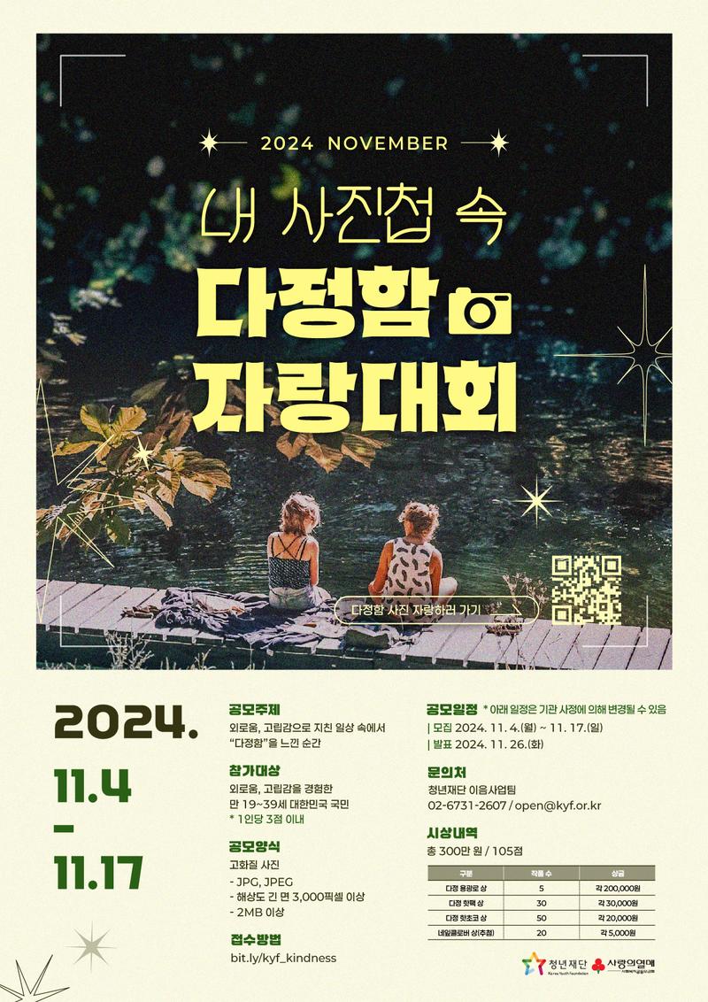▶ 공모일정: (모집) 2024. 11. 4.(월) ~ 11. 17.(일) / (발표) 2024. 11. 26.(화)