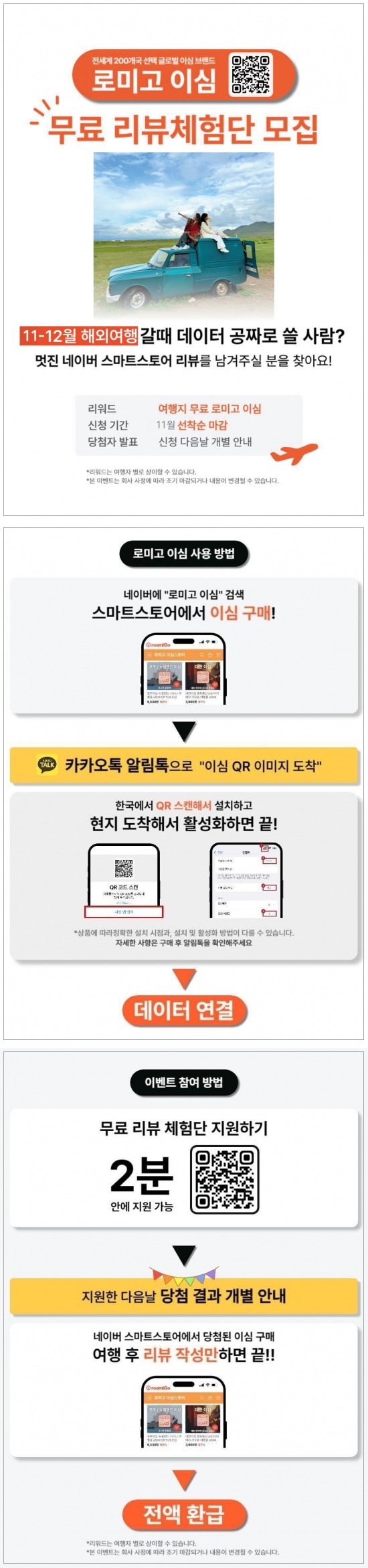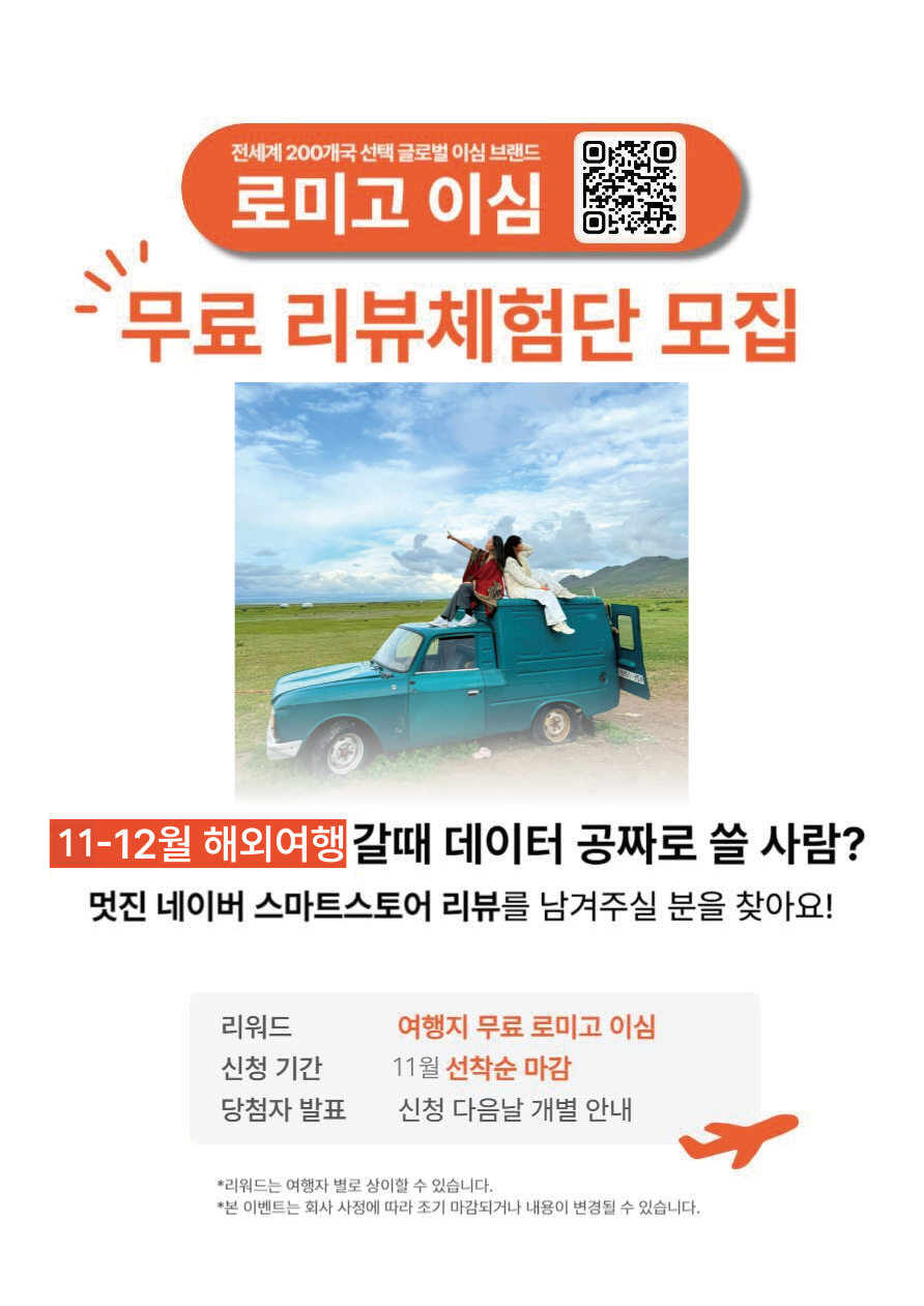 2분안에 로미고 이심 무료 리뷰체험단 지원서를 작성하고, 전 세계 어디서나 로컬 데이터 즉각 연결 가능한 해외 여행 필수템 이심으로 데이터 로밍 해결해 보세요!