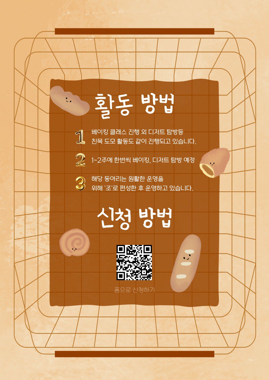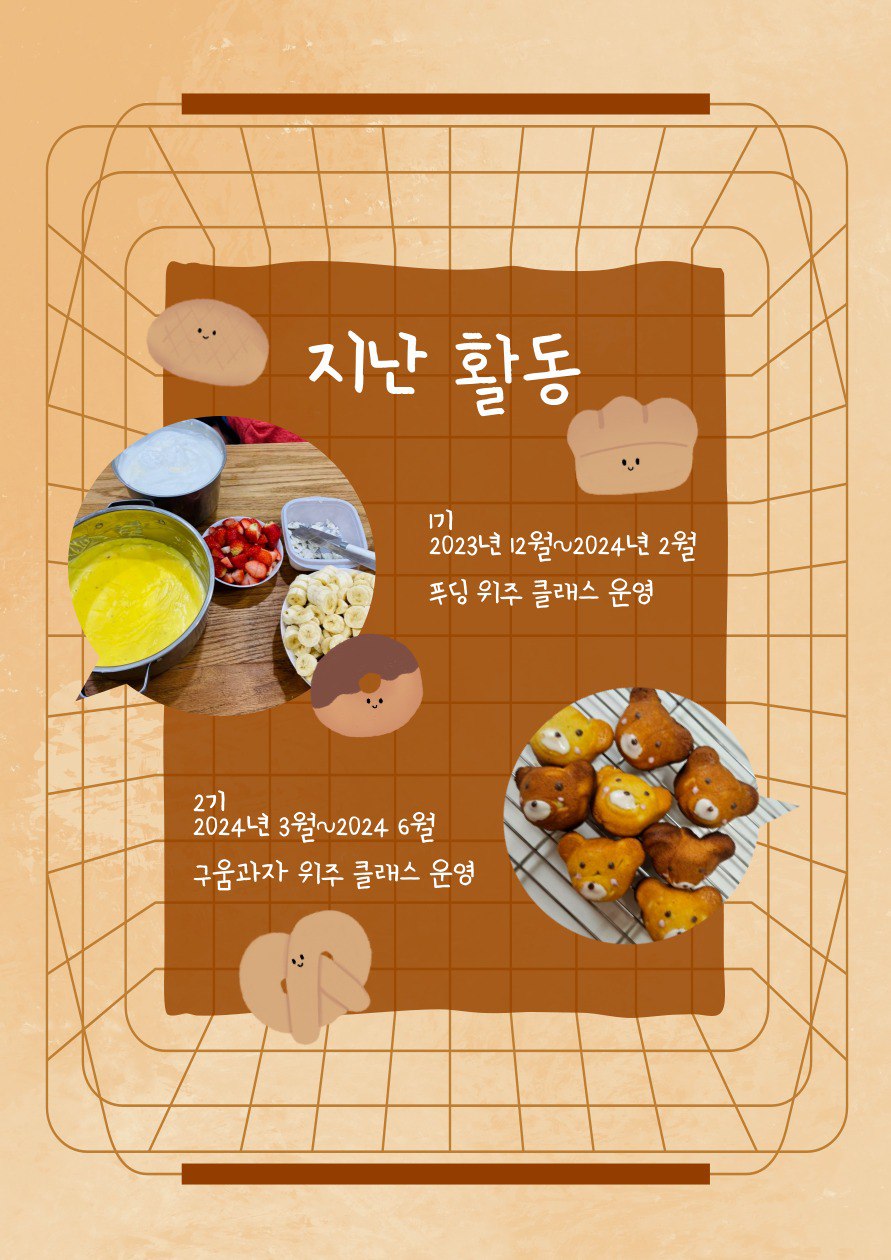 (베이킹 클래스 진행시 3~4명이상의 사람이 동시에 진행되는 경우 클래스 진행이 원활하게 운영되지 않아 매번 활동마다 운영진이 사다리를 탄후 조를 나눠드리고 있습니다.)