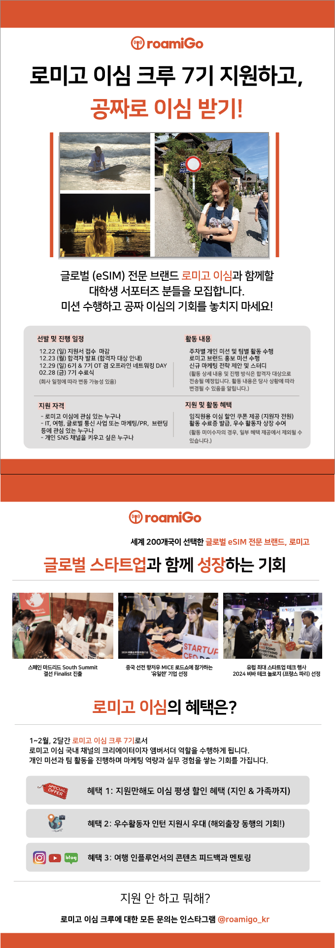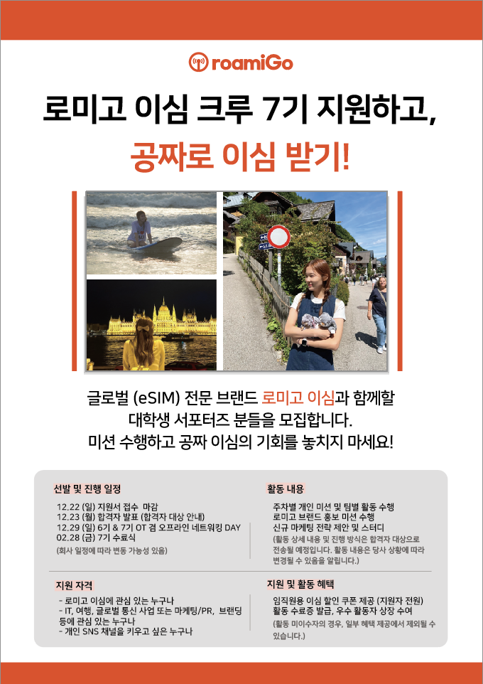 🎉 200+개국 통신 연결을 지원하는 글로벌 eSIM 브랜드 ’로미고 Roamigo‘와 함께 이심의 혁신성을 알리고 브랜드 마케팅을 경험하실 분을 찾습니다.