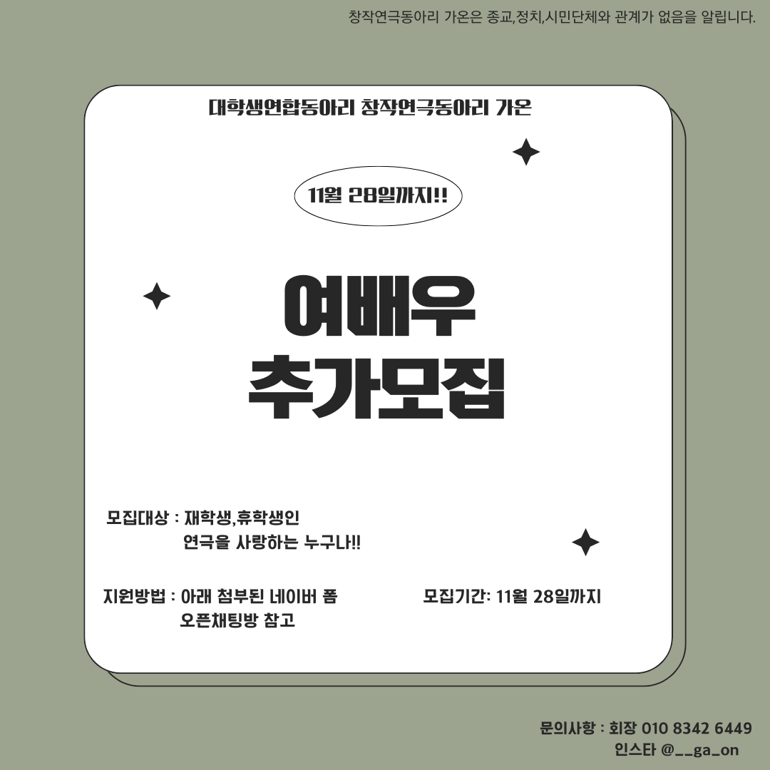 🪶창작연극동아리 가온에서 여배우를 추가모집합니다.🪶